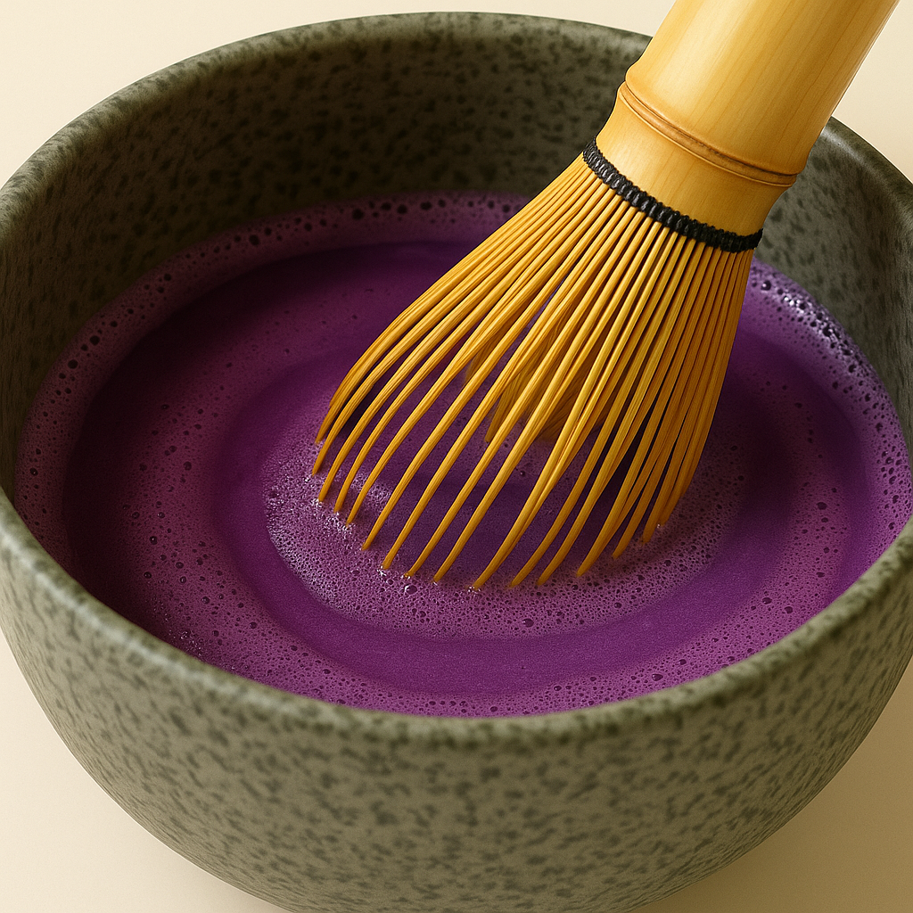 Use a bamboo whisk to mix in a zigzag motion until the texture becomes smooth and velvety. This is where the purple ritual begins.